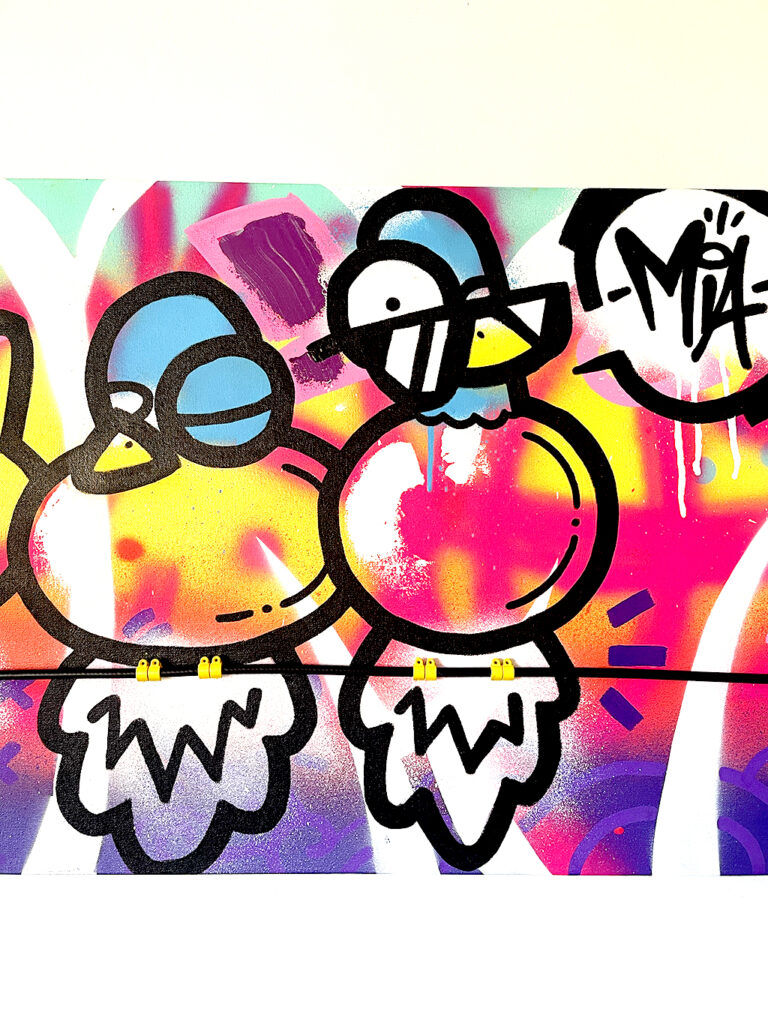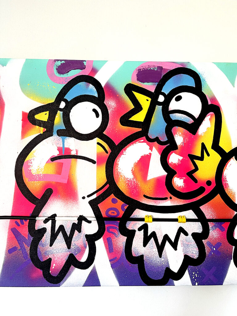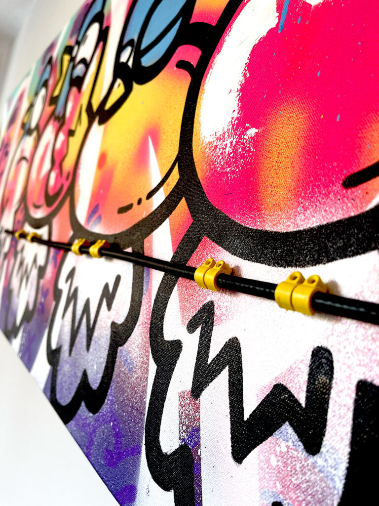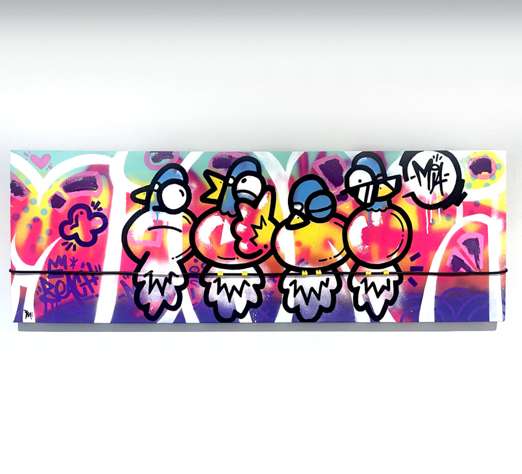 150x50cm. 4 Palometas enjoying a party on a beautiful Miami sunset. Phone cable, oil painting, spray and acrylics over canvas.